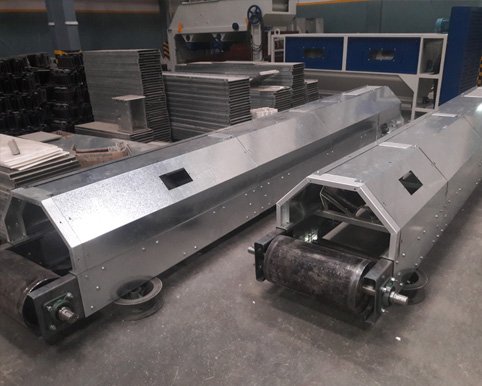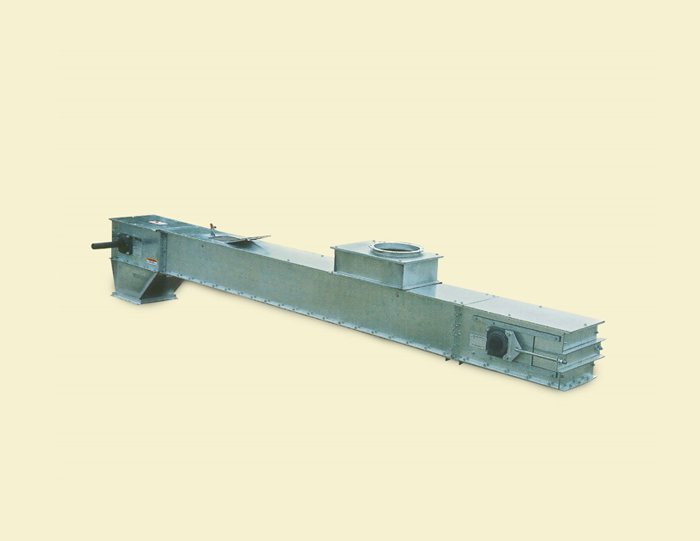 Intermediate Section: Rigid steel troughs make the Bali Group Conveyor a better choice. Rugged 8 gauge (4 mm) steel lines the bottom, and 11 gauge (3 mm) steel sides round out the conveyor trough. The bolt-together construction is ideal for overseas shipment because of reduced cubic footage. Bottom sections are staggered to assure a smooth connection- eliminating misalignment.